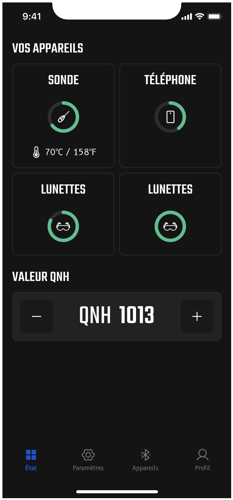 The interface ensures the display of the system status: connections, versions, battery level, probe temperature, QNH value, display units, alert messages, etc.
