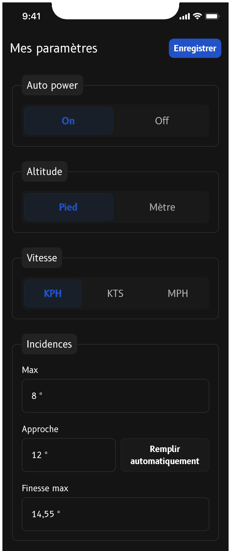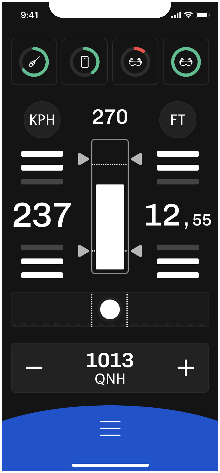 The mobile app allows, through its interface, the setup of the probe and the system. It is thus possible to enter the QNH value before each flight and potentially during the flight, choose the display units, or adjust the display of the augmented reality glasses.
